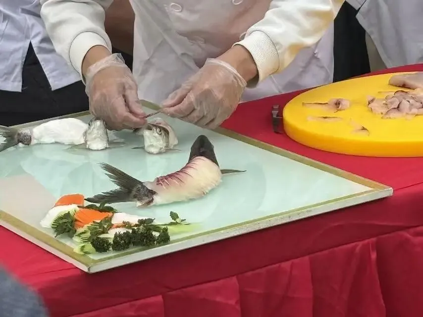 加工环节严格对标《横县鱼生制作技术规程》,将非遗技艺与标准化流程深度融合。明确活鱼需经3天活水净化,重量控制在150-1500克之间,采用“单飞”“双飞”“肾花”“木马架”四大核心刀法,每片鱼肉厚度精准控制在1-2毫米;辅料需通过20余项农残检测,生熟加工区域物理隔离,刀具、容器专人专用,从工艺细节筑牢食品安全防线。