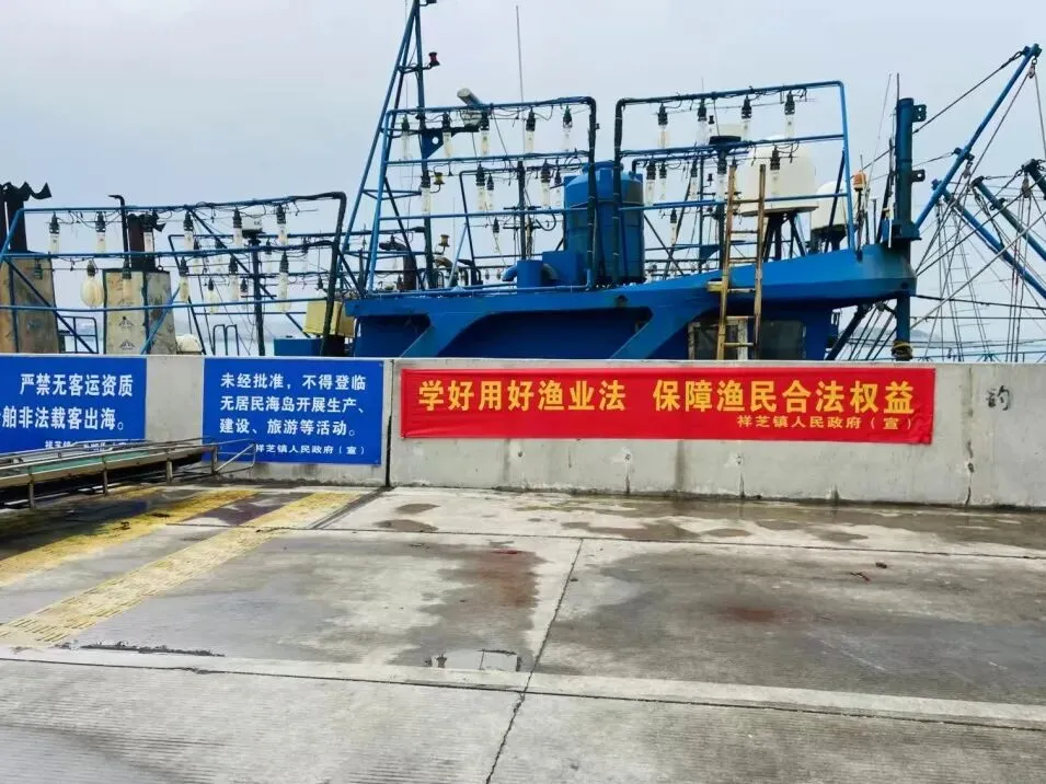 祥芝镇制作 20 条贴合上级宣传导向的《中华人民共和国渔业法》宣传横幅,内容涵盖 “严守《中华人民共和国渔业法》红线,共护海洋生态家园”等核心标语,全面覆盖全镇各码头、澳口、渔港进出口,让船东渔民进出渔港即可直观感受、学习新法知识。同时,发动各渔村村委会充分利用村级 LED 宣传栏,滚动播放新法宣传标语与核心条款,通过持续推送、反复强化,落实上级 “深入渔区、渔村开展宣传” 的工作要求,确保线下宣传无死角、全覆盖。