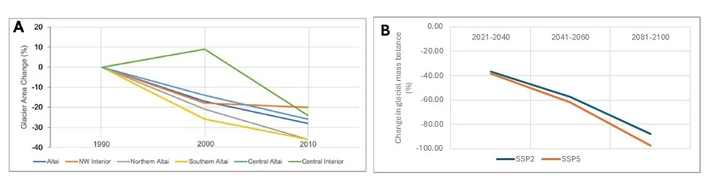 Figure 1(A and B) Change in glacier area during 1990-2010 and (B) projected change in glacier mass balance (2021-2100) in Mongolia under climate change scenarios