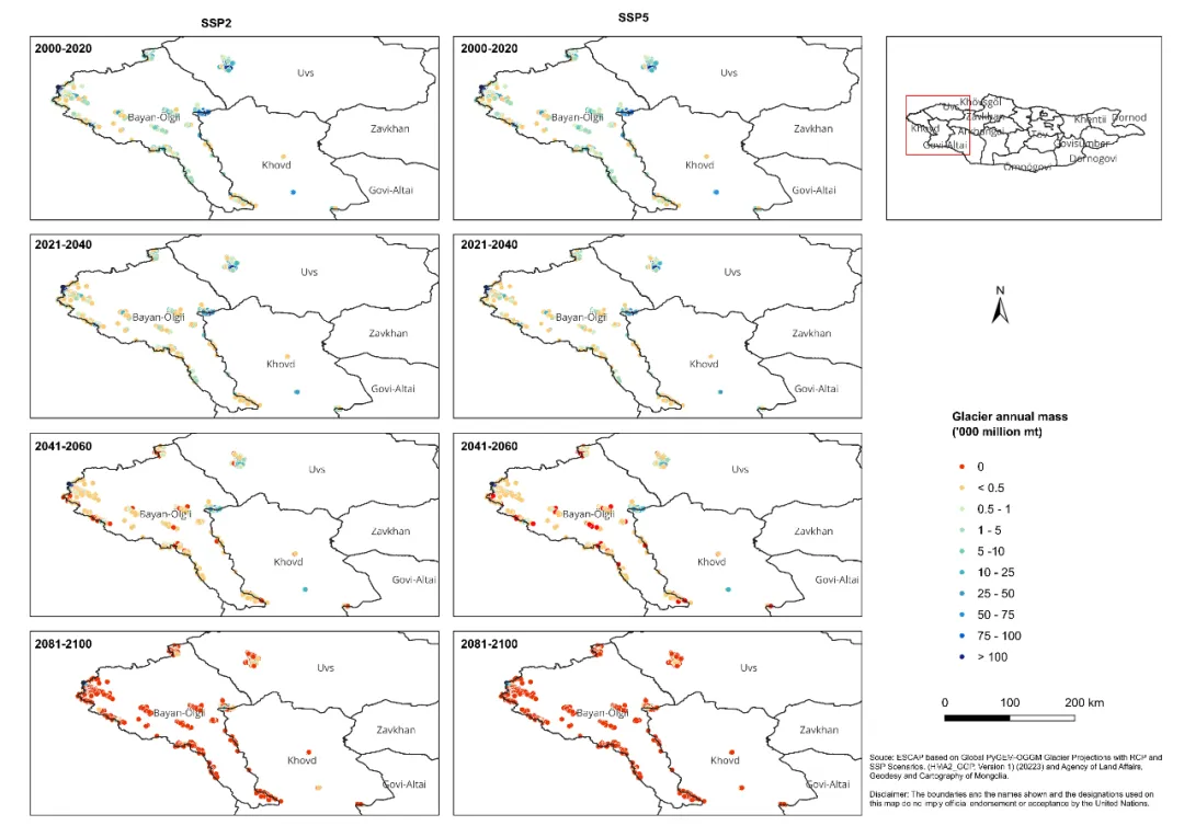 Analysis using downscaled IPCC climate projections available on ESCAP’s Risk and Resilience Portal suggests that this trend is likely to continue in the coming decades and by 2,100 many western Altai glaciers may disappear entirely (Figures 1A and 1B).