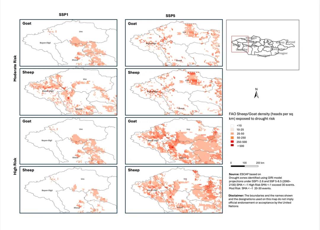 ESCAP drought-exposure modelling shows that the western provinces already face chronic low-to-medium drought intensity, with worsening conditions under future scenarios (Figure 3).