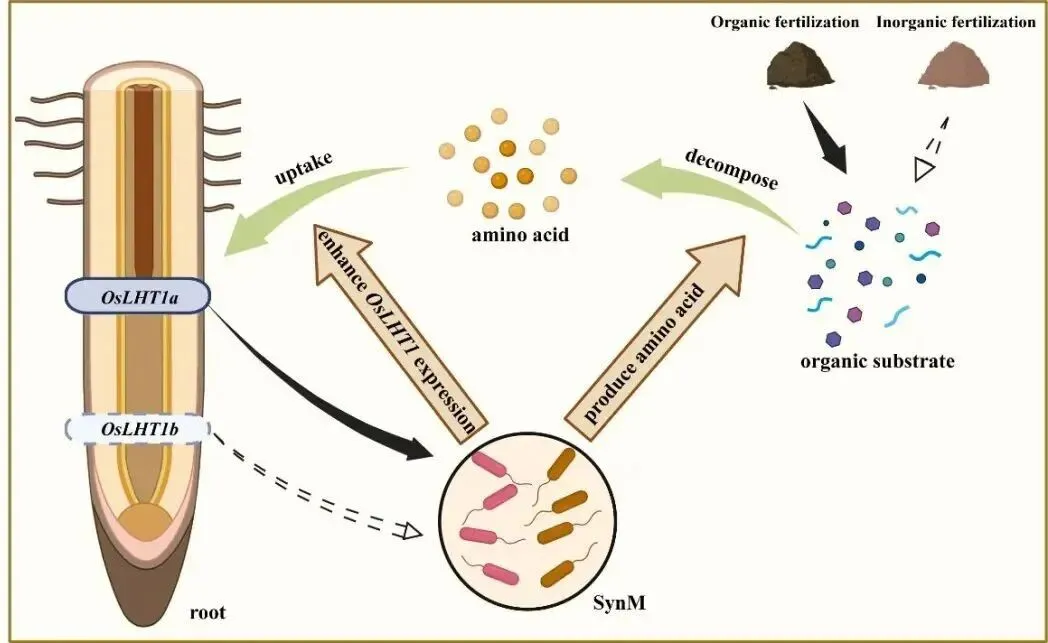 研究团队前期发现水稻氨基酸转运蛋白OsLHT1基因的遗传变异使粳稻的氨基酸吸收能力显著高于籼稻。该研究通过全国水稻主栽区不同品种与土壤肥力的调查,发现OsLHT1a单倍型(主要为粳稻)的氨基酸高效吸收性状与其主要有机质高的种植环境及根际富集的功能微生物特征相关。利用从粳稻根际筛选的富集菌株,构建了具有协同提高水稻氨基酸吸收效率的合成菌群SynM。该菌群提高水稻根系吸收氨基酸(15N标记的天冬氨酸)达1.4倍。利用oslht1突变体及回交材料,明确SynM的根际组装过程主要受OsLHT1基因控制,并且该组装过程可以通过“遗留效应”促进后茬水稻对有机氮的利用。田间条件下,SynM与有机肥配施,可显著提高有机肥的当季肥效,水稻增产12.4%。