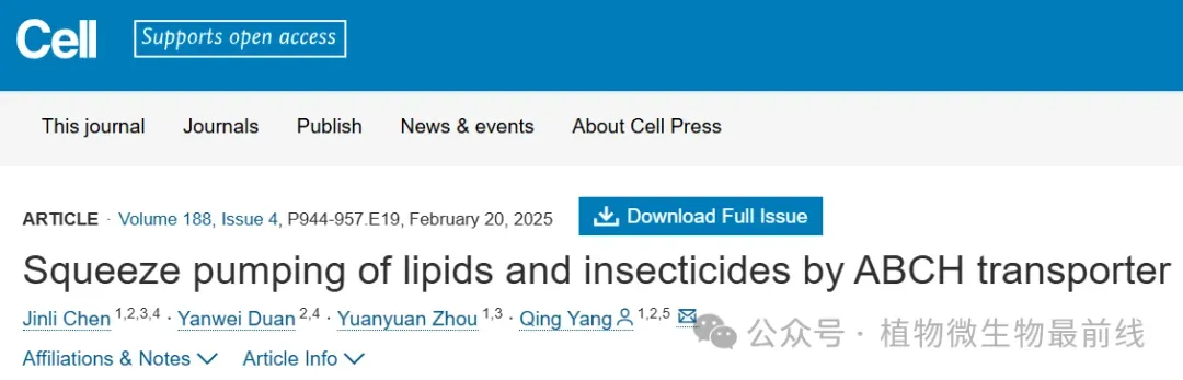 2024年12月24日,《Cell》在线发表了杨青团队题为“Squeeze pumping of lipids and insecticides by ABCH transporter”最新研究成果。研究揭示了ABCH转运蛋白转运脂质和外排农药的分子机制,并获得了能够抑制转运功能的小分子抑制剂。该研究解析了害虫的“外部防御”和“解毒”机制,并找到了能直接用于合成绿色农药的有效成分。植物病虫害综合治理全国重点实验室、中国农业科学院深圳农业基因组研究所为该论文的第一单位。杨青为论文通讯作者,大连理工大学博士研究生陈金利、中国农业科学院植物保护研究所段燕伟博士为该论文共同第一作者。