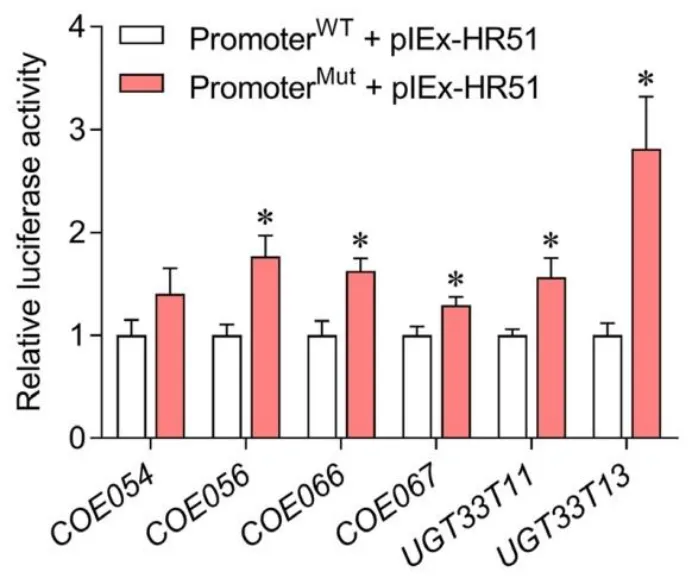 RNA-seq分析显示HR51是唯一在斜纹夜蛾中肠和脂肪体均显著下调的转录因子;HR51敲除突变体对黄毒素的耐受性显著提升,幼虫体重抑制程度大幅降低;敲除HR51后,斜纹夜蛾中肠和脂肪体中的P450s、COEs、GSTs、UGTs等解毒基因呈显著上调趋势,其中中肠UGTs和脂肪体COEs上调最为明显;双荧光素酶实验证实HR51可直接抑制多个COEs和UGTs基因的启动子活性,定点突变HR51在解毒基因启动子上的结合顺式元件后,其抑制作用显著消失。