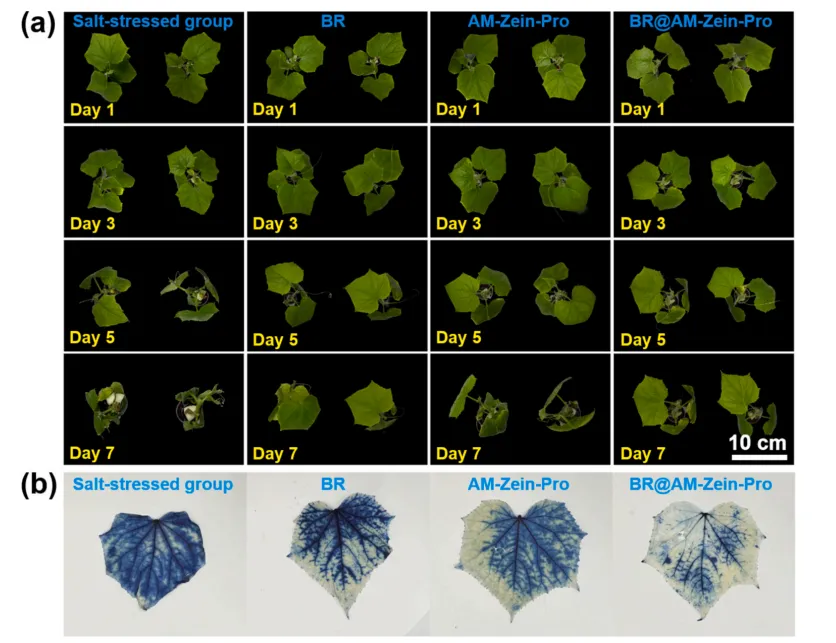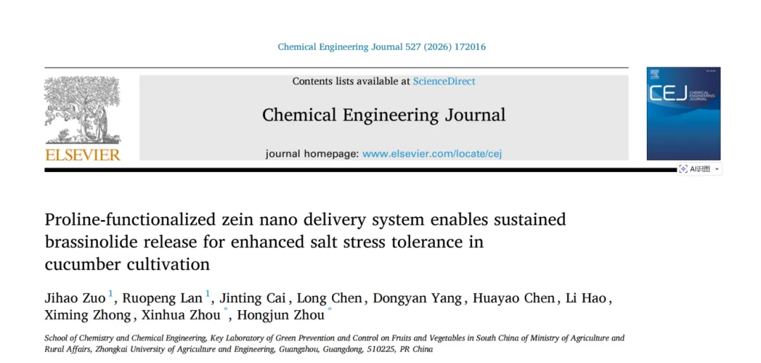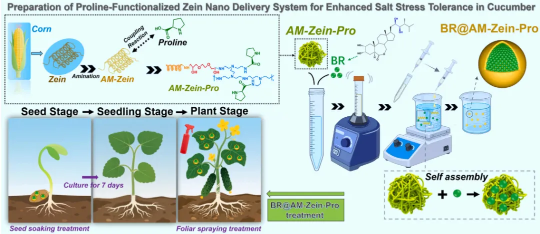 近期,周新华教授/周红军教授团队(仲恺农业工程学院,农业农村部华南果蔬绿色防控重点实验室)报道了一种基于玉米醇溶蛋白(Zein)的生物基纳米递送系统(BR@AM-Zein-Pro),用于递送植物激素芸苔素内酯(BR),以系统性增强黄瓜在整个生长周期(种子、幼苗、成株)的耐盐性。其创新性在于将材料功能化、激素缓释与多重抗逆机理有机结合,解决了传统BR应用中持效期短、治疗窗口窄、高浓度易产生药害的核心难题。