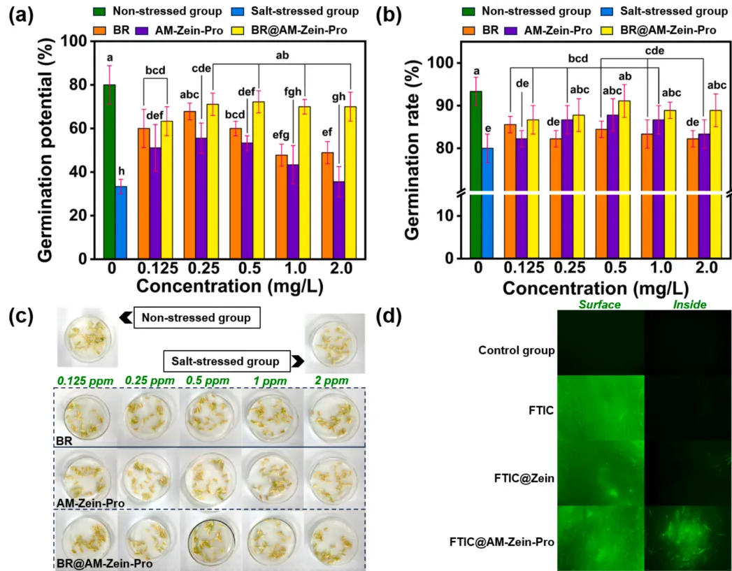 图. (a) 经不同浓度BR、AM-Zein-Pro和BR@AM-Zein-Pro处理后的黄瓜种子发芽潜力。(b) 经不同浓度BR、AM-Zein-Pro和BR@AM-Zein-Pro处理三天后的黄瓜种子外观。(c) 经不同浓度BR、AM-Zein-Pro和BR@AM-Zein-Pro处理后的黄瓜种子发芽率。(d) 经FITC、FITC@Zein和FITC@AM-Zein-Pro处理24小时后的黄瓜种子荧光显微镜图像。