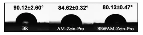 图. 黄瓜叶面上的BR、AM-Zein-Pro和BR@AM-Zein-Pro悬浮液的初始静态接触角测量结果。