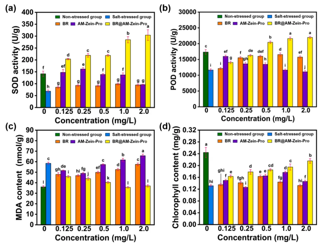 图. (a)超氧化物歧化酶(SOD)活性,(b)过氧化物酶(POD)活性,(c)丙二醛(MDA)含量和(d)叶绿素含量,这些数据来自用不同浓度的BR、AM-Zein Pro和BR@AM-Zein-Pro处理7天的黄瓜种子培育的幼苗。