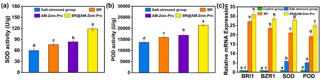 图. (a) 叶面喷施BR、AM-Zein-Pro和BR@AM-Zein-Pro分散液后黄瓜植株的SOD活性,(b) POD活性。 (c) BR代谢信号通路中BRI1、BZR1、SOD和POD基因的相对mRNA表达。