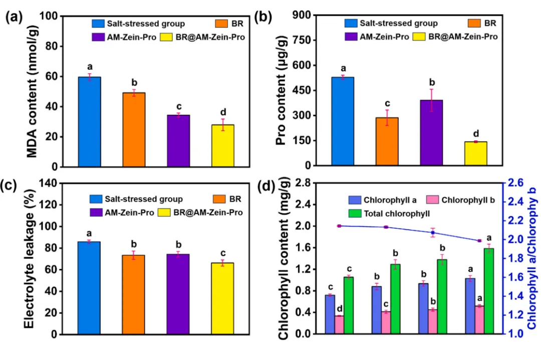 图. (a) 黄瓜植株叶面喷施BR、AMZein-Pro和BR@AM-Zein-Pro分散液后的MDA含量分析,(b) 脯氨酸含量分析,(c) 电解质渗漏分析,以及(d) 叶绿素含量分析。