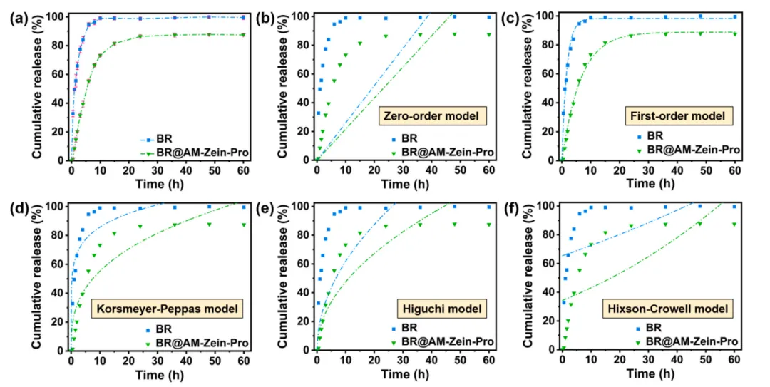图. (a) BR和BR@AM-Zein-Pro的累积释放曲线。 (b ~ f) 分别使用零级动力学模型、一级动力学模型、Korsmeyer-Peppas模型、Higuchi模型和Hixson-Crowell模型拟合的BR和BR@AM-Zein-Pro的代表性拟合曲线(点表示原始释放数据,而虚线表示拟合曲线)。