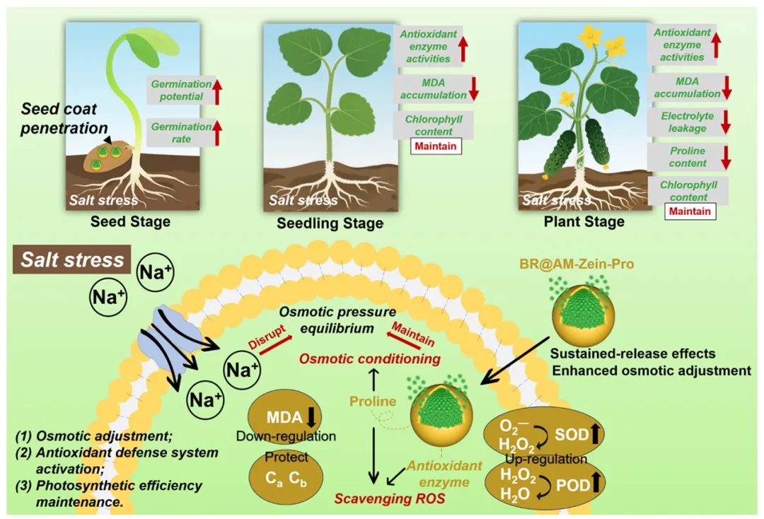 BR@AM-Zein-Pro 通过纳米载体功能与协同缓释BR所激活的多尺度机制(控制释放动力学延长BR持效时间、维持植物激素最佳浓度窗口、增强渗透调节能力、激活抗氧化防御系统并保护光合效率),显著增强了黄瓜的耐盐性。