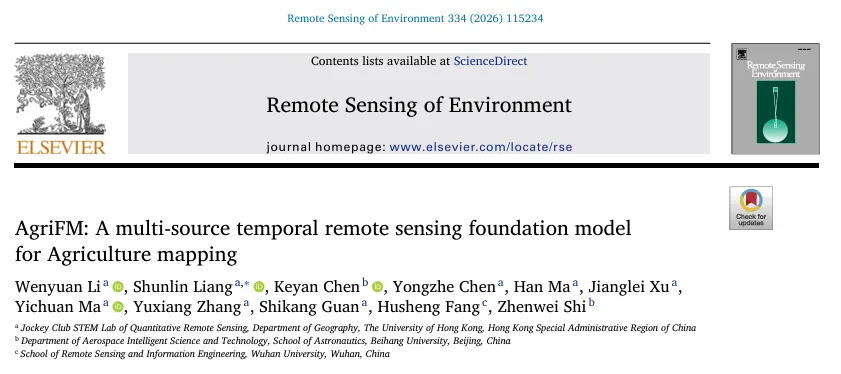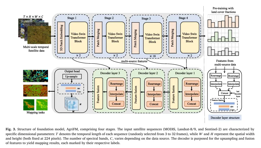 AgriFM 的主干基于 Video Swin Transformer,但核心改动在于:在分层下采样(patch merging)时不仅压缩空间分辨率,也同步压缩时间维度,从而让模型能在计算可控的前提下处理更长、更灵活的序列输入(文中指出预训练迭代中可动态采样 3–32 帧)。与此同时,为三种传感器分别设计 3D Conv 的 patch embedding,使多源输入先被投影到统一 token 空间,再进入四阶段层次化时空特征提取。该结构兼顾“田块边界等细粒度空间细节”与“作物生长季的长时序动态”,为农业制图类像素任务提供更贴合的表征学习路径。