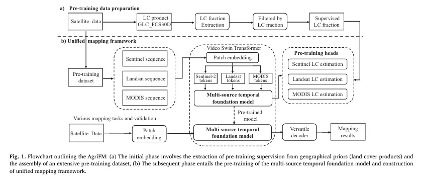 本文将方法划分为两个紧密耦合的阶段:第一阶段从全球多源遥感序列中构建预训练样本,并从全球土地覆盖产品中抽取地表覆盖比例作为监督信号;第二阶段在完成基础模型预训练后,构建一个面向多任务的统一制图框架,通过可扩展解码器将主干输出转化为不同下游任务的像素级制图结果。该设计的关键点在于:用“地表覆盖比例”把不同传感器(分辨率、光谱配置、重访周期不同)的表示学习拉到同一语义目标上,同时让模型在结构上具备从“预训练表征”平滑迁移到“多任务制图”的能力。