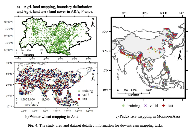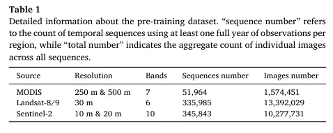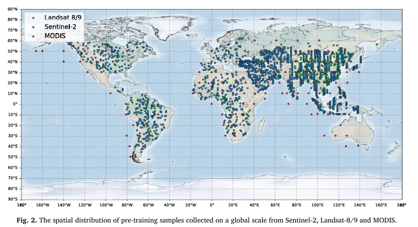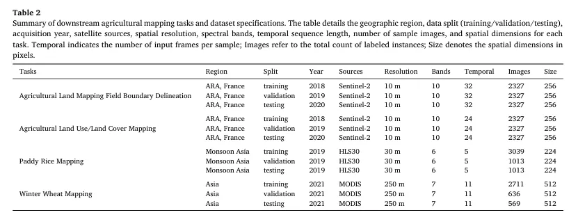 作者构建了一个覆盖全球的多源时序预训练数据集,输入来自 MODIS(250/500 m)、Landsat-8/9(30 m)、Sentinel-2(10/20 m)。数据被裁剪为 224×224 图像块,并为每个样本生成至少覆盖完整年度的时间序列(最短序列长度≥16),同时过滤“几乎全为背景地类”的样本以增强监督有效性。数据规模上,最终总计 25,244,211 张影像:其中 MODIS 1,574,451 张、Landsat 13,392,029 张、Sentinel-2 10,277,731 张;对应的时序序列数量分别为 51,964 / 335,985 / 345,843。这种“全球分布 + 年周期时序”的构造,使模型在预训练阶段就能接触到多样的作物物候与地表类型组合,为后续农业制图任务提供更强的时空先验。