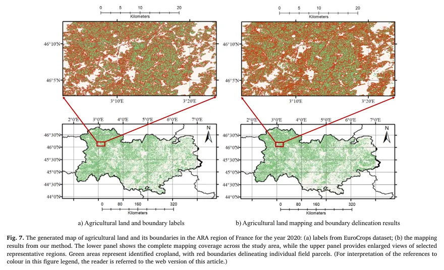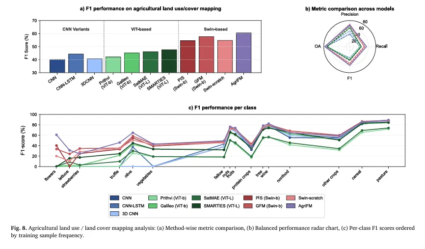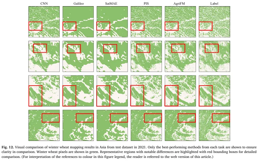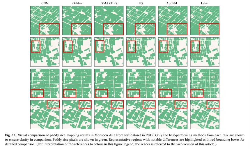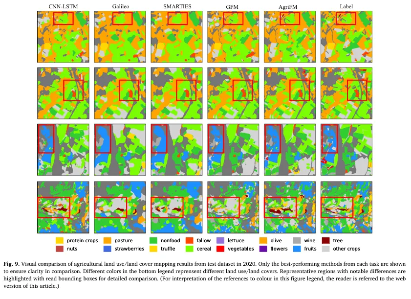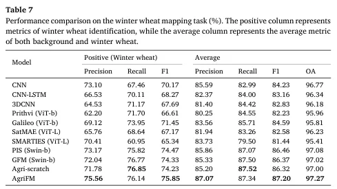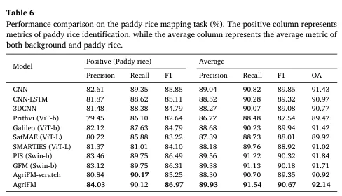为验证“农业制图通用基础模型”的有效性,作者选择了 5 类下游任务,覆盖法国 ARA 区域的耕地/边界/用地覆被制图,以及亚洲季风区水稻制图、亚洲冬小麦制图。数据划分强调时间泛化:例如 ARA 区域使用 2018 训练、2019 验证、2020 测试;输入时序长度也按任务设定(如 32 帧、24 帧等),以验证模型对不同时间长度的适配能力。评估上采用 Precision/Recall/F1/OA 等指标,并对“正类(如耕地/边界/作物)”与“背景+正类平均”分别汇报,确保既衡量目标类别识别能力,也衡量整体像素级制图质量。