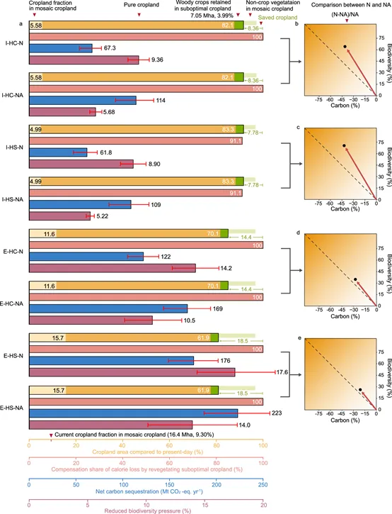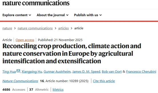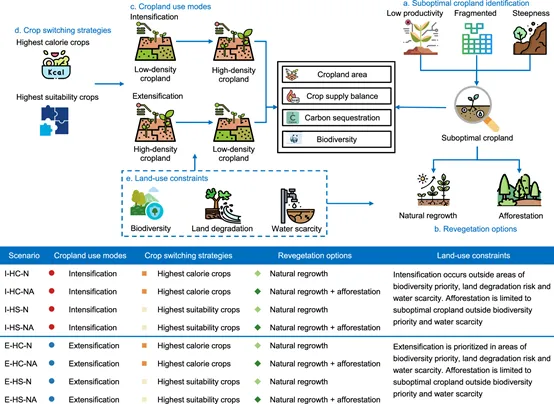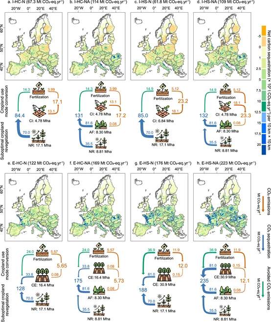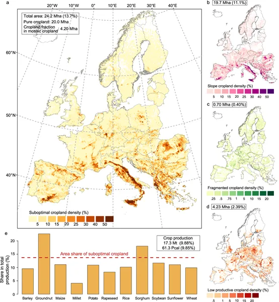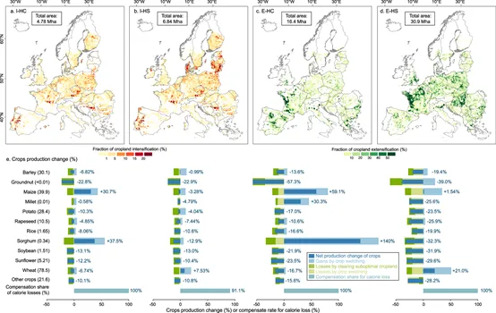 1. 系统识别欧洲次优耕地并量化其转型潜力:明确了欧洲约2420万公顷次优农田的空间分布,并评估其退耕恢复植被对气候缓解和生物多样性保护的潜在贡献。2. 提出集约化与粗放化协同的粮食补偿路径:通过在剩余耕地中实施集约化或粗放化管理(如引入树木地块)并结合作物结构调整,可在多种情景下弥补退耕带来的产量损失。3. 定量揭示多目标协同与权衡关系:粗放化情景在碳减排和生物多样性保护方面的协同效益显著高于集约化情景,而集约化情景主要承担产量补偿功能,其环境协同效应相对有限。图1 用于识别次优耕地并评估耕地管理策略对欧洲土地—气候—生物多样性关系影响的研究框架示意图。图2 欧洲次优耕地的空间分布及其对作物总产量的相对贡献。