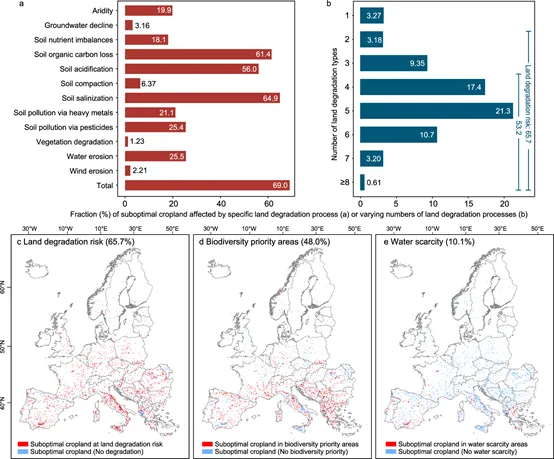 图3 次优农田在土地退化风险区、生物多样性优先区及水资源受限区域中的分布特征。