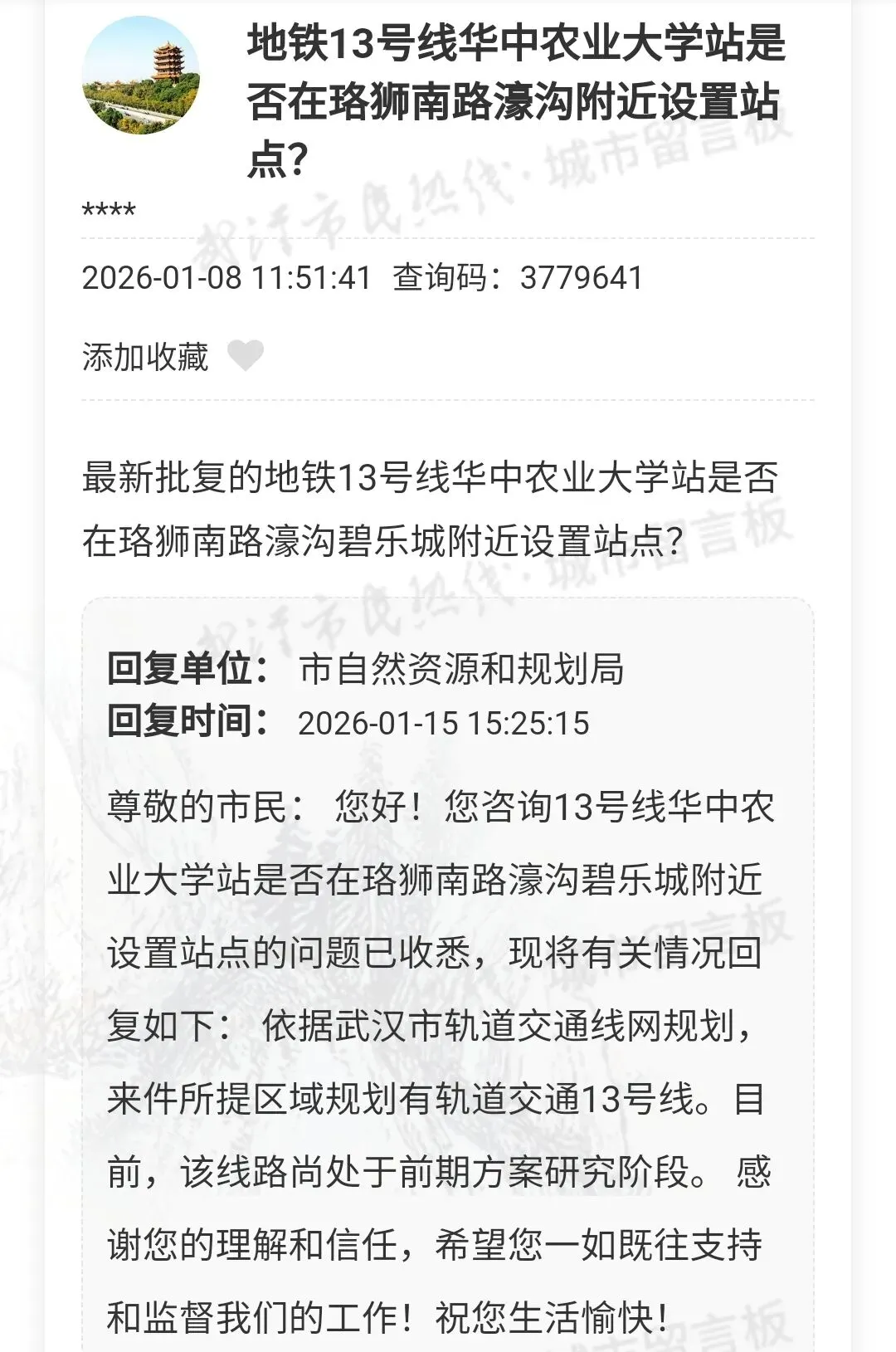市自规局:轨道交通13号线拟在华中农业大学设站!在碧乐城附近