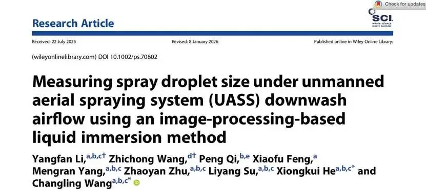 近日,中国农业大学理学院应用化学系、农业无人机系统研究院、药械与施药技术研究中心、智慧农业无人系统高水平创新团队在农林科学领域国际期刊Pest Management Science(中科院1区TOP)上发表了题为“Measuring Spray Droplet Size under Unmanned Aerial Spraying System (UASS) Downwash Airflow Using an Image-Processing-Based Liquid Immersion Method”的研究论文。