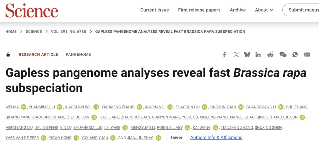 自白垩纪中期以来,被子植物为何能迅速崛起,并在极短时间内完成爆发式多样化的?这一达尔文提出的“恼人之谜”(abominable mystery),至今仍是一个悬而未决的难题。基因组学和泛基因组学的最新进展为研究开花植物的快速进化和发育开辟了新途径。然而,高质量的无间隙基因组和泛基因组资源的缺乏限制了我们全面了解基因组和泛基因组结构及多样性,以及它们与植物表型变异之间联系的能力。在驯化过程中迅速多样化的作物,例如白菜(Brassica rapa),可能是解答此类问题的合适对象。2026 年 2 月 5 日,河北农业大学赵建军教授、马卫教授、洪益国教授及河南省农科院蔬菜研究所原玉香研究员,比利时根特大学 Yves Van de Peer 教授作为共同通讯作者(马卫、刘远铭、张晓孟、魏小春、李晓楠、刘照坤、袁凌云、李光光为论文共同第一作者),在国际顶尖学术期刊 Science 期刊发表了题为:Gapless pangenome analyses reveal fast Brassica rapa subspeciation 的研究论文,据悉,这也是河北农业大学校史上首篇 Science 论文。该研究从基因组、泛基因组和泛遗传学三个层面系统刻画了白菜亚种快速分化的遗传基础,把被子植物“快速扩张”这一达尔文的“恼人之谜”具象化为一个肉眼可见的演化框架之中。通过构建完整着丝粒图谱,揭示了卫星重复、着丝粒动态与结构变异在芸薹属物种演化中的关键作用,加深了对芸薹属基因组起源与分化顺序的认识。同时这一系列高质量图谱与分析体系,为今后在芸薹属乃至更广泛十字花科作物中开展功能和演化研究提供了研究范例。