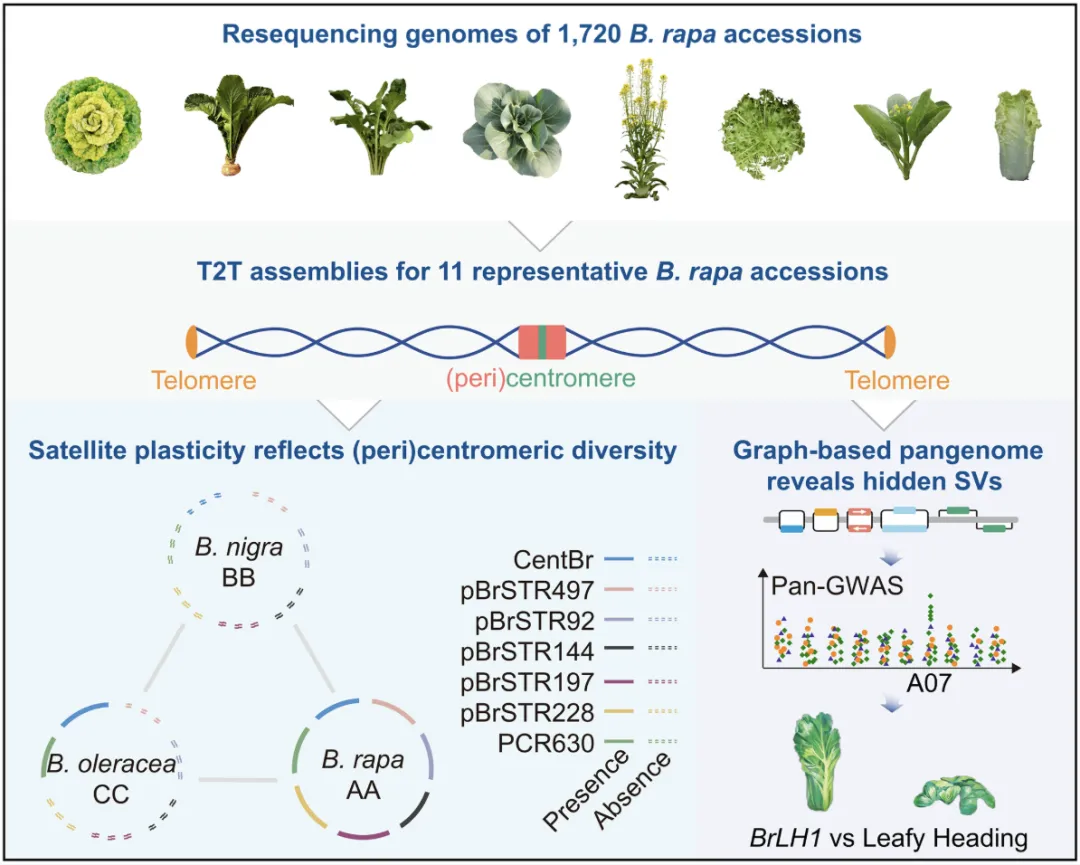研究团队通过制备白菜 CENH3 特异抗体并开展 ChIP-seq,在 11 份代表材料的每一条染色体上逐一“点亮”功能着丝粒,首次在白菜各亚种中完整绘制出 110 个(泛)着丝粒的结构图谱,挖掘出 5 种未知的白菜泛着丝粒特异卫星重复序列(satellites);以图泛基因组为框架系统梳理全基因组结构变异,构建了覆盖31份材料的结构变异(SV)图谱,共鉴定出超过 27 万条结构变异,建构了“结构变异地图”;提出了一个“SV-亚种特异基因-着丝粒模块”的三元协同演化模型:结构变异和亚种特异基因提供形态分化的主要遗传基础,着丝粒的模块化重塑在保证发育稳健性的同时为基因组创新“腾挪空间”,三者共同推动白菜在有限时间内形成多样化亚种,也即快速演化的着丝粒与广泛存在的结构变异相互作用,构成了驱动白菜亚种“快速分化”的基因组发动机。