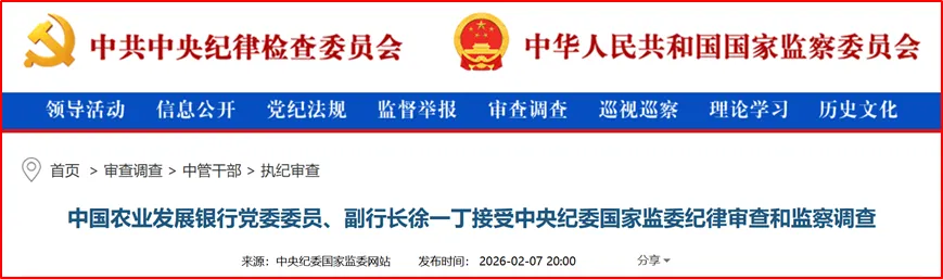 2026年2月7日,中央纪委国家监委网站发布消息,中国农业发展银行党委委员、副行长徐一丁涉嫌严重违纪违法,目前正接受中央纪委国家监委纪律审查和监察调查。