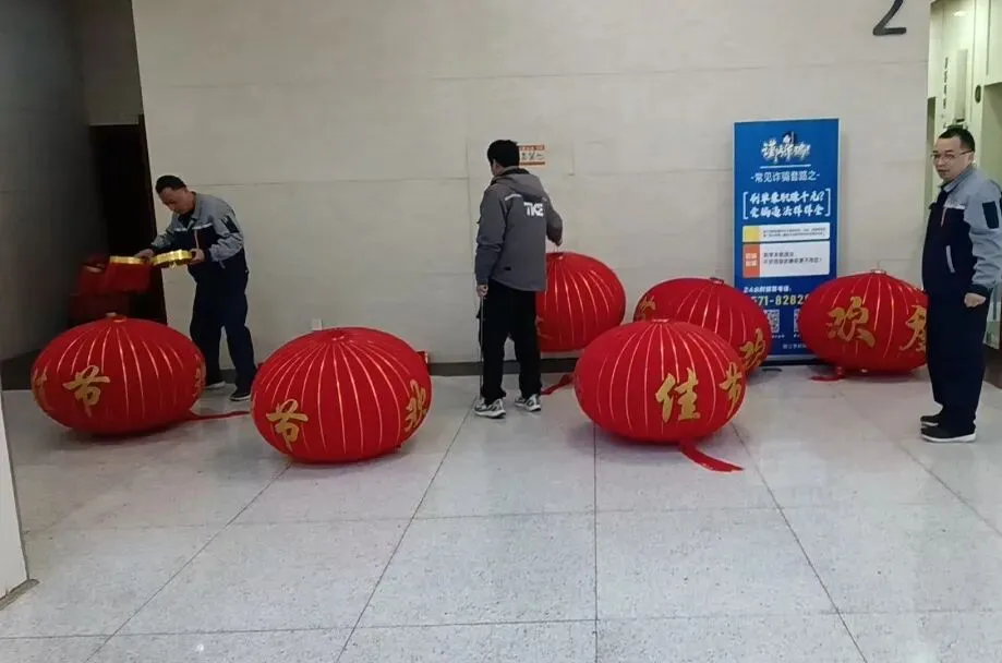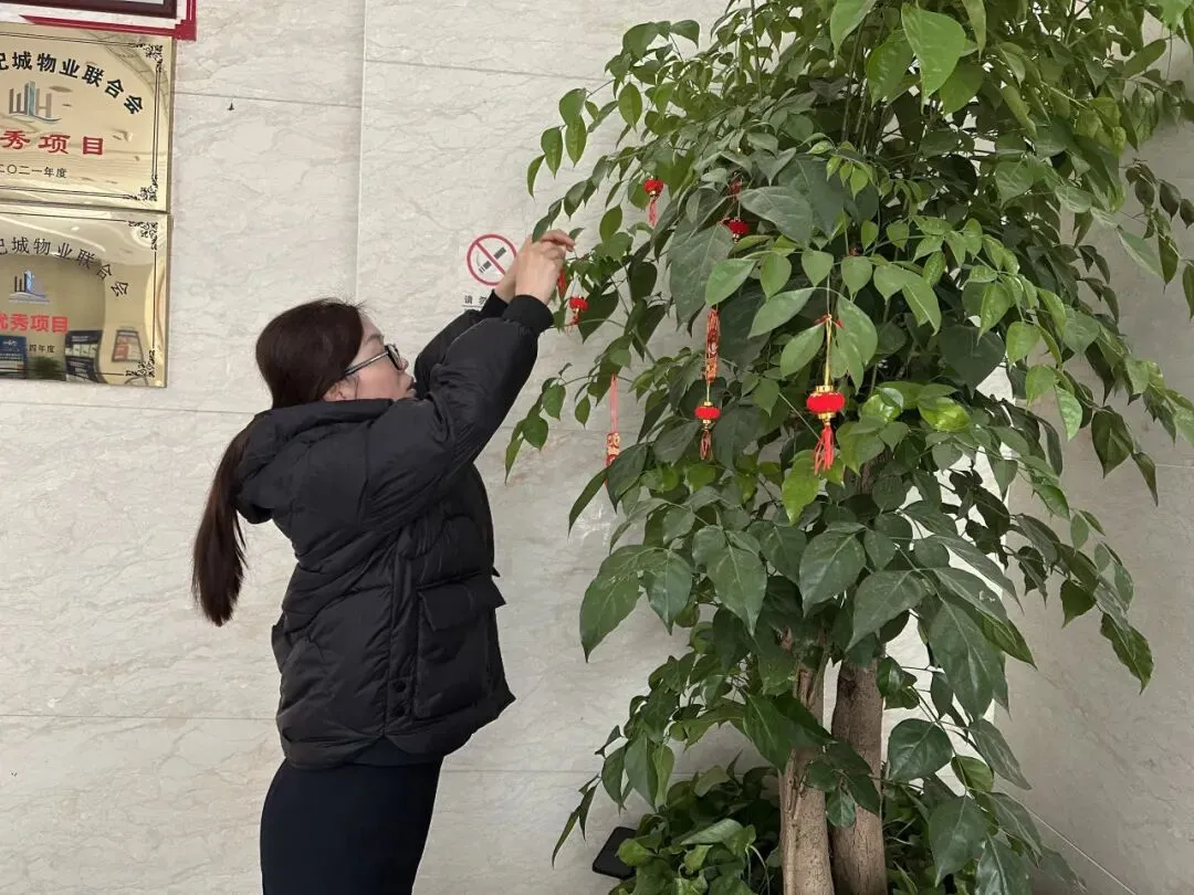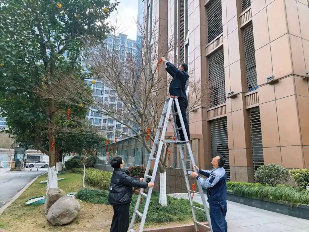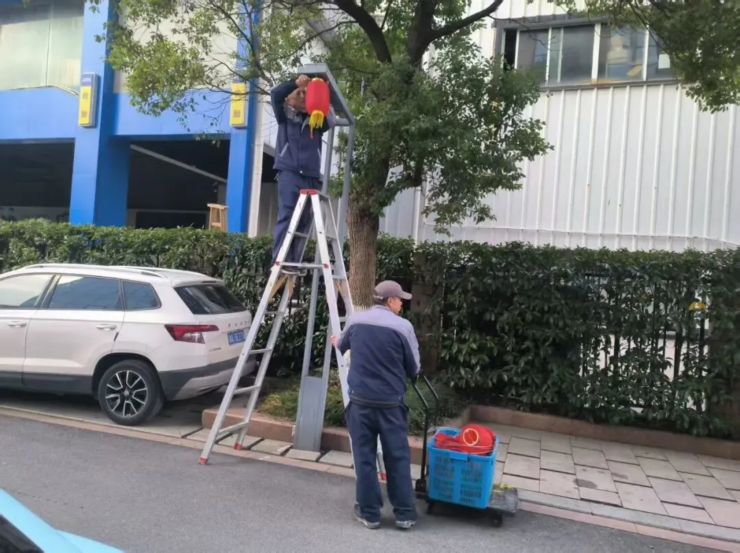 物业服务中心提前组织工作人员在大厦入口处及主干道上悬挂灯笼、安装彩灯,处处洋溢着浓浓的年味,营造“优美亮丽”的春节氛围。