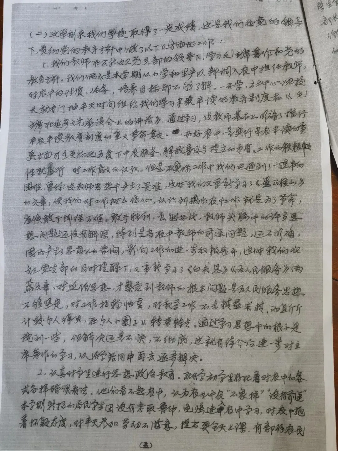 (一)我校现有初一、初二两个班级,学生78人,其中贫下中农子女40人(笔者注:其余大多是镇上居民学生),教师2人。本学期来在公社党委、大队支部及学校行政的领导下,坚持党的教育方针,坚持半农半读,学校有了适当发展,并逐步得到巩固。主要取得了以下几方面的成绩: