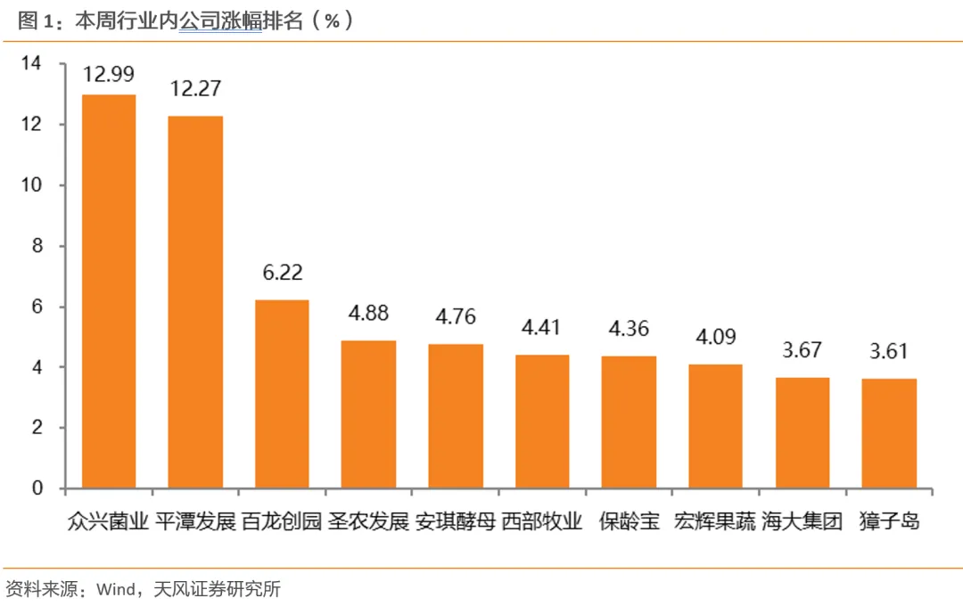 2)投资建议:黄鸡产能仍处于历史相对底部,价格对需求边际变化敏感性高于供给,我们认为黄鸡价格或已筑底完成,后续有望边际好转。短期来看,前期行业普遍亏损,导致在产父母代存栏量均值下半年环比下降,且亏损持续影响行业投苗积极性,9-11月行业已连续三个月出现投苗量环比减少,对未来价格弹性形成支撑;中长期看,行业不断洗盘,利好优质龙头市占率进一步提升。相关标的:【立华股份】、【温氏股份】。