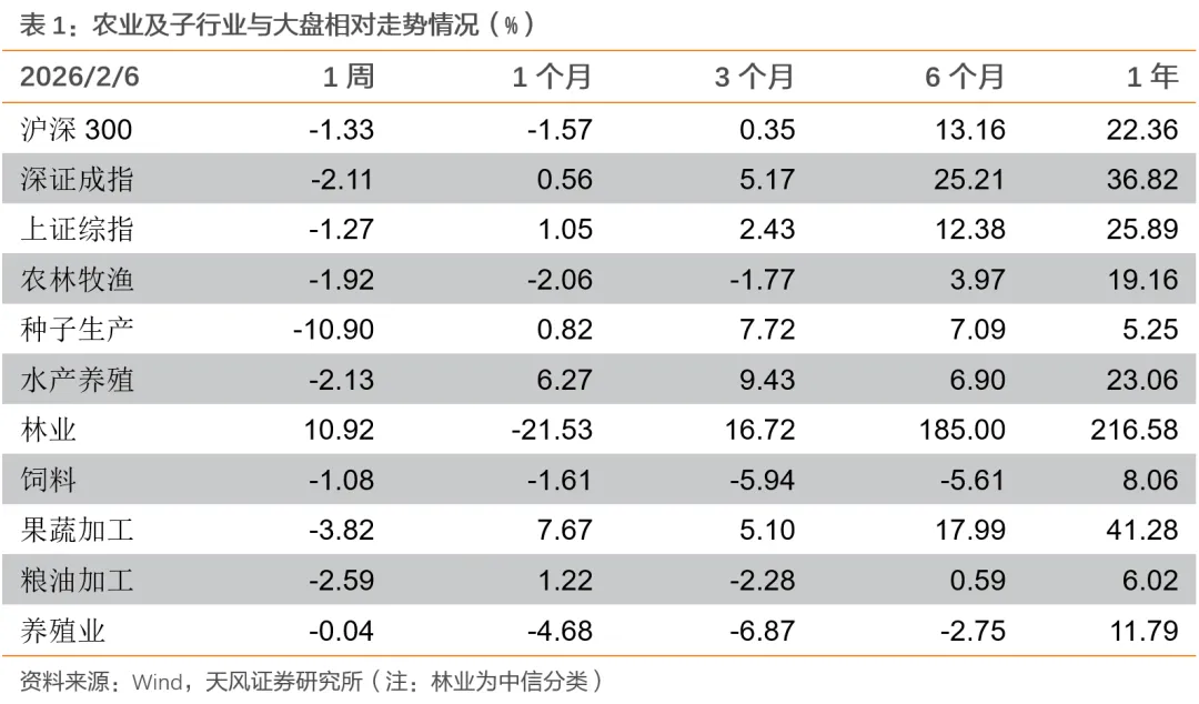 1)年腊八过后的需求端表现弱势,供给压力延续,拖累价格偏弱调整。截至2026年2月6日,全国生猪均价猪价12.06元/kg,较上周末下跌1.47%;本周7kg断奶仔猪价格为366元/头,随着前期仔猪价格大幅上涨,补栏积极性受抑制,价格止涨回稳。供应端,本周行业出栏均重为127.40kg(环比-0.46kg),散户出栏均重为142.05kg,临近春节养殖主体出栏积极性较强,此外近期二育出栏意愿存在,或进一步加剧供给。需求端,毛猪价格波动使屠企宰量先降后升,周后期因价格下跌后白条订单改善和利润预期增强而有所回升,本周日度屠宰样本日均宰杀量环比增加0.99%。供强需弱情况下,我们预计后续猪价仍易跌难涨。政策引导减产&养殖亏损&疫病干扰情况下,预计后续产能或持续去化。