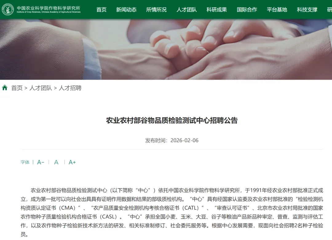 农业农村部谷物品质检验测试中心(以下简称“中心”)依托中国农业科学院作物科学研究所,于1991年经农业农村部批准正式成立,成为第一批可以向社会出具具有证明作用数据和结果的部级质检机构。“中心”具有经国家认监委及农业农村部批准的“检验检测机构资质认定证书(CMA)”、“农产品质量安全检测机构考核合格证书(CATL)”、“审查认可证书”、北京市农业农村局批准的国家农作物种子质量检验机构合格证书(CASL)。“中心”承担全国小麦、玉米、大豆、谷子等粮油产品新品种审定、普查、监测与评估工作,以及农作物种子检验新技术新方法的研发、相关标准制修订、社会委托服务等。根据中心发展需要,现面向社会招聘2名种子检验员。
