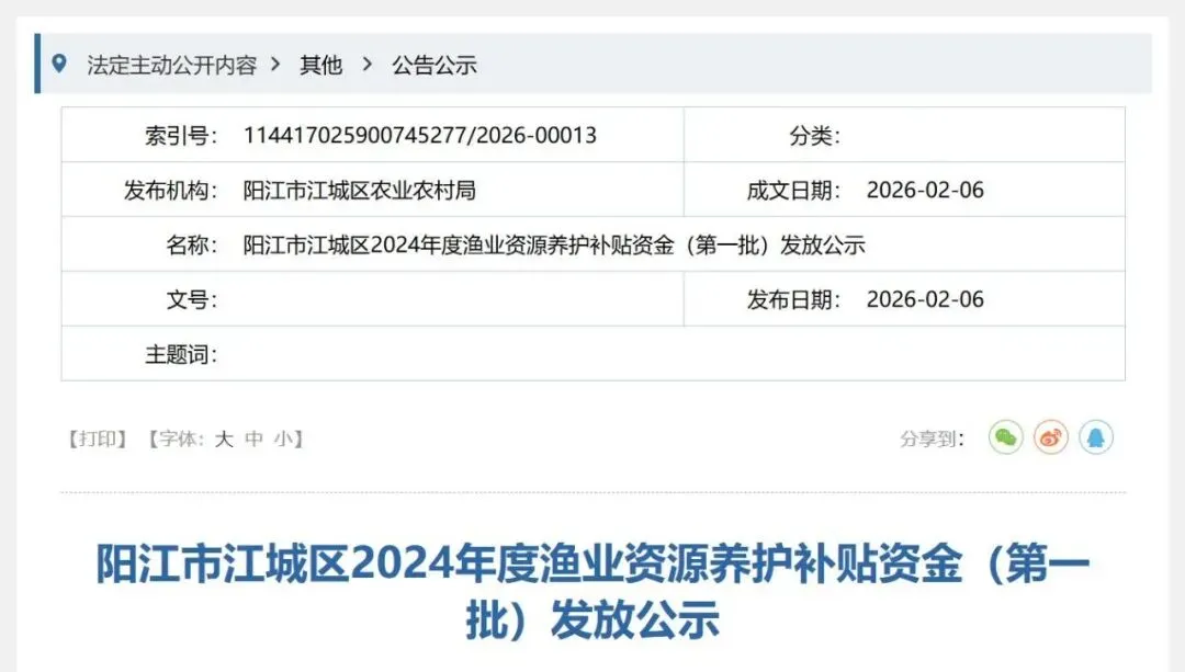 根据《农业农村部办公厅财政部办公厅关于实施海洋渔业资源养护补贴政策的通知》(农办计财[2021〕44号)和广东省农业农村厅、广东省财政厅《关于印发〈广东省海洋渔业资源养护补贴政策实施方案〉的通知》(粤农农规[2022]4号)要求,现将阳江市江城区2024年度渔业资源养护补贴资金(第一批)予以公示。