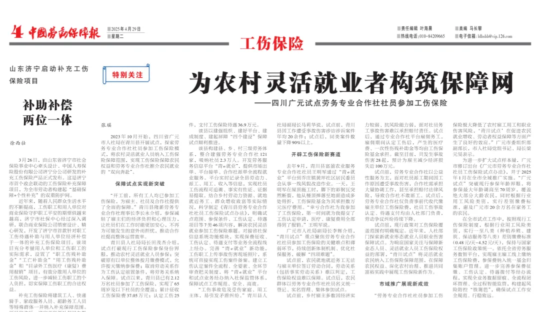2025年4月29日,中国劳动保障报报道“四川广元试点劳务专业合作社社员参加工伤保险”