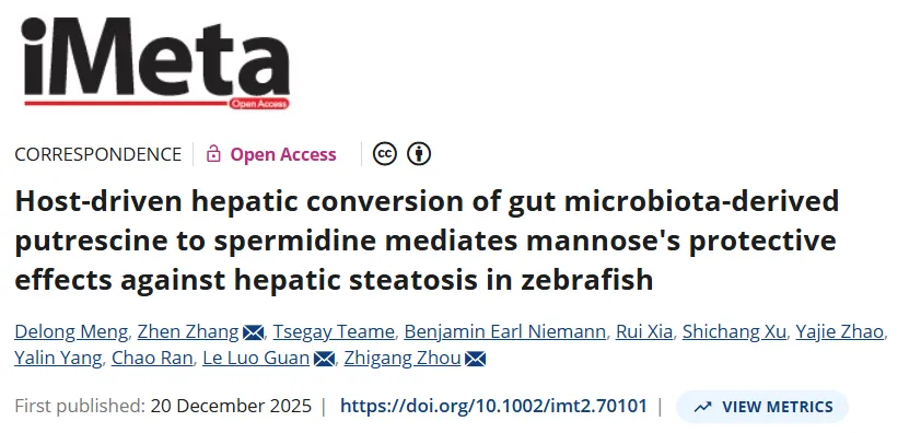 2025年12月20日,中国农业科学院饲料研究所水产微生物与饲料创新团队研究发现一种肠道微生物与宿主之间跨界协同产生有益代谢物的机制,为深入理解肠肝轴在代谢健康中的作用提供了突破性视角。相关研究成果以“Host-driven hepatic conversion of gut microbiota-derived putrescine to spermidine mediates mannose's protective effects against hepatic steatosis in zebrafish”为题发表在《iMeta》。