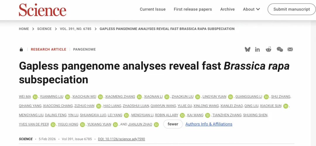 2月6日,Science刊发河北农业大学赵建军教授团队及国内外多家科研机构共同完成题为“Gapless pangenome analyses reveal fast Brassica rapa subspeciation”的研究成果。该研究为达尔文提出的“被子植物为何能在地球上迅速崛起、并在极短地质时间内完成爆发式多样化”这一悬而未决的“恼人之谜”提供了新的基因组学视角,以白菜为切入口,系统描绘了“白菜王国”如何从一个共同祖先演变为“诸侯并立”的多亚种格局,构建了一个将经典进化问题落地到具体作物系统的基因组学研究范例。文章很深奥,外行人不太容易明白,但这不影响我们从冷门院校、冷门专业发表高水平论文看高考志愿。