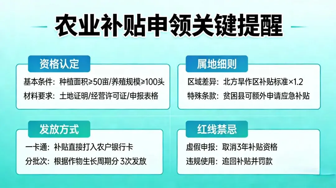 • 资格认定:实际种植农户、家庭农场、合作社均可申领;土地流转需在合同中明确补贴归属,避免纠纷。