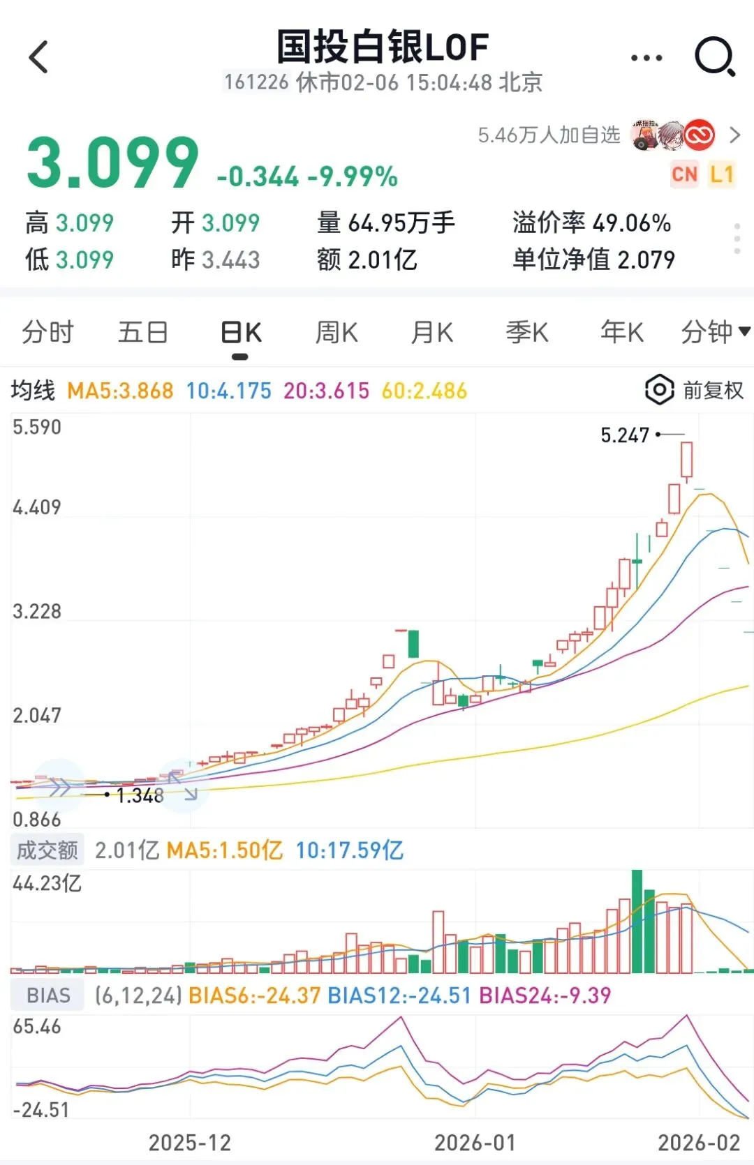 再说一下国投白银,连续跌停一周,申购自1月28日停止以来还没有恢复。国投基金已紧急公告成立工作小组研究工作方案妥善处理这突发情况,积极回应投资者诉求了。家里老板手上还有200元自己忙过头忘记处理了,她自己也闷闷不乐,但我跟她说反正都是利润来的,你随它吧。