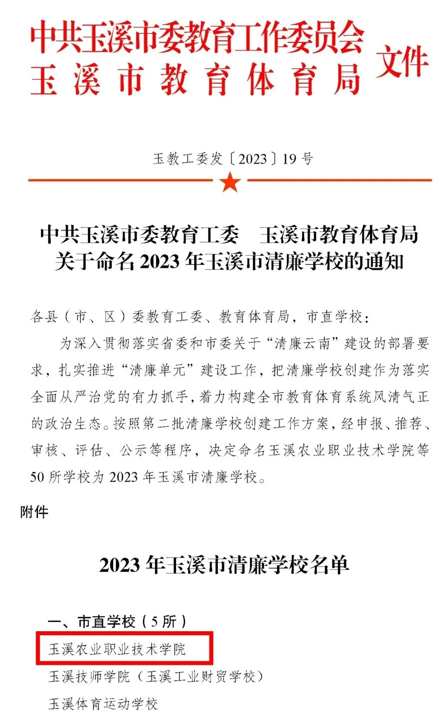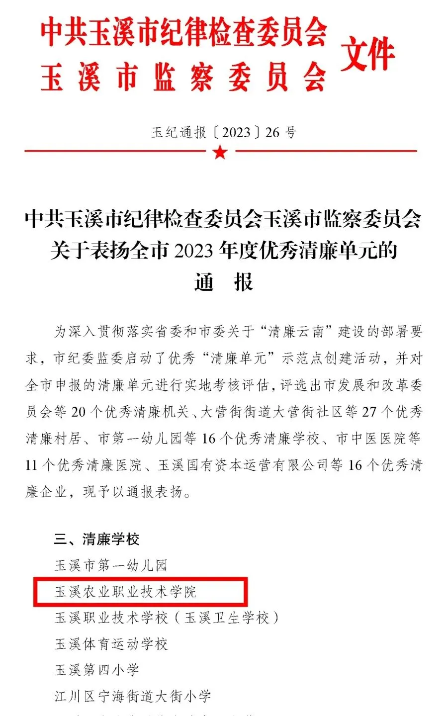 喜讯 | 玉溪农业职业技术学院被玉溪市委教育工委命名为玉溪市“清廉学校” 被玉溪市纪委监委评选为玉溪市优秀“清廉学校”