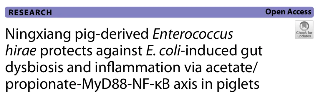 肠道炎症多由微生物失调和感染驱动,是亟待解决的健康难题,目前有效治疗手段有限。挖掘具有抗炎特性的益生菌菌株并阐明其作用机制,对开发肠道炎症新型治疗策略至关重要。海氏肠球菌作为乳酸菌的一种,在低腹泻率宁乡仔猪体内丰度显著更高,但其对大肠杆菌诱导肠道炎症的缓解作用及分子机制尚未明确。2026 年 1 月 6 日,湖南农业大学谭碧娥、王婧团队在《Microbiome》发表题为 “Ningxiang pig-derived Enterococcus hirae protects against E. coli-induced gut dysbiosis and inflammation via acetate/propionate-MyD88-NF-κB axis in piglets” 的研究性论文。该研究结合体内外实验、微生物组学、代谢组学、分子对接及公共数据集分析等技术,系统探究了宁乡猪源海氏肠球菌缓解大肠杆菌诱导仔猪肠道炎症的作用及分子机制。研究证实,该菌株可通过恢复肠道菌群平衡、促进乙酸和丙酸等短链脂肪酸合成,进而抑制 MyD88-NF-κB 信号通路激活,减少促炎细胞因子表达,同时该机制在克罗恩病患者中存在潜在临床相关性,为细菌性肠道炎症的益生菌和后生元治疗提供了新的理论依据和候选菌株。