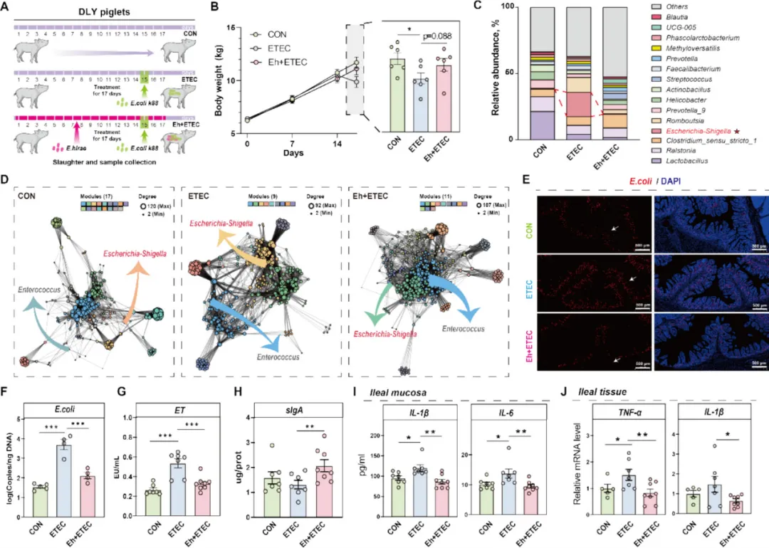 体外抑菌实验显示,该海氏肠球菌对大肠杆菌、沙门氏菌、金黄色葡萄球菌均有抑制作用,其中对大肠杆菌抑制效果最显著。构建大肠杆菌诱导的仔猪肠道炎症模型,将 24 日龄 DLY 仔猪分为对照组(CON)、大肠杆菌感染组(ETEC)、海氏肠球菌干预 + 大肠杆菌感染组(Eh+ETEC)。结果显示,海氏肠球菌可逆转大肠杆菌诱导的仔猪体重下降,16S rRNA 测序表明其能恢复感染仔猪肠道菌群 α、β 多样性,降低变形菌门丰度,提升梭菌属、普雷沃氏菌属等有益菌丰度,显著降低埃希氏 - 志贺氏菌属的相对丰度和定植量。菌群网络分析显示,海氏肠球菌可恢复被大肠杆菌破坏的微生物群落稳定性,提升肠球菌属的生态地位。同时,该菌株能显著降低仔猪血清肠毒素(ET)水平,恢复回肠 sIgA 水平,降低回肠黏膜促炎细胞因子 IL-1β、IL-6 含量及 TNF-α、IL-1β 基因表达,有效缓解大肠杆菌诱导的肠道炎症和肠屏障损伤。