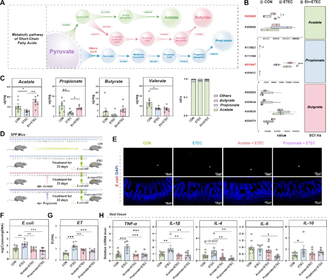功能预测分析显示,海氏肠球菌可调控丙酮酸代谢通路,全基因组测序证实其携带乙酸、丙酸合成相关基因(K00926、K0184)。仔猪实验发现,大肠杆菌感染显著降低回肠食糜中乙酸、丙酸、戊酸浓度,而海氏肠球菌干预可特异性升高乙酸和丙酸水平(丁酸水平无显著变化),且宁乡仔猪粪便中乙酸、丙酸浓度显著高于约克夏仔猪。构建乙酸 / 丙酸干预的大肠杆菌感染小鼠模型,证实乙酸和丙酸可显著抑制大肠杆菌在小鼠回肠的黏附与定植,降低血清 ET、DAO 水平,减轻肠道形态损伤,且丙酸的作用效果更显著;同时可下调回肠组织 TNF-α、IL-1β、IL-4、IL-6 等促炎细胞因子基因表达,证实乙酸和丙酸是海氏肠球菌缓解肠道炎症的关键后生元。