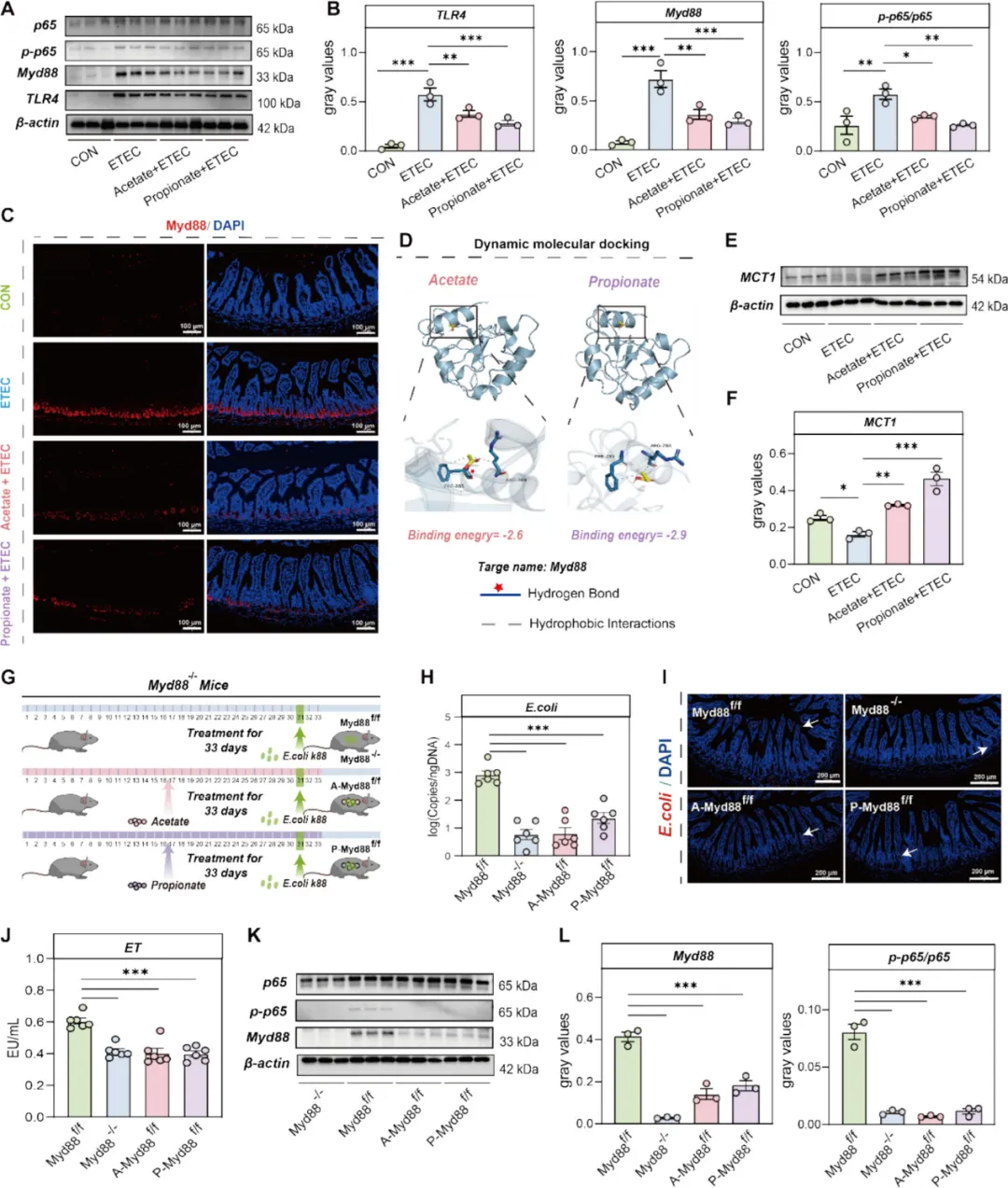 机制研究发现,大肠杆菌感染可显著激活仔猪、小鼠及 IPEC-J2 肠上皮细胞中 TLR4-MyD88-NF-κB 信号通路,上调 TLR4、MyD88、p65 蛋白及基因表达,而海氏肠球菌、乙酸 / 丙酸干预可显著逆转该通路的异常激活。分子对接实验证实,乙酸和丙酸可与 MyD88 蛋白直接结合,结合位点为 PHE-285 和 ARG288,其中乙酸与 MyD88 的 PHE-285 形成氢键,结合亲和力更强。乙酸和丙酸可上调大肠杆菌感染小鼠回肠组织单羧酸转运蛋白 1(MCT1)表达,而海氏肠球菌可显著升高感染仔猪回肠 SLC16A1(编码 MCT1)基因表达,提示 SCFAs 需通过 MCT1 转运进入细胞发挥作用。构建肠道上皮细胞特异性 MyD88 敲除(Myd88⁻/⁻)小鼠模型,证实敲除 MyD88 可达到与乙酸 / 丙酸干预相似的效果,显著抑制大肠杆菌定植、降低血清 ET 水平、缓解肠道炎症,证实乙酸 / 丙酸通过靶向 MyD88-NF-κB 通路发挥抗炎作用。
