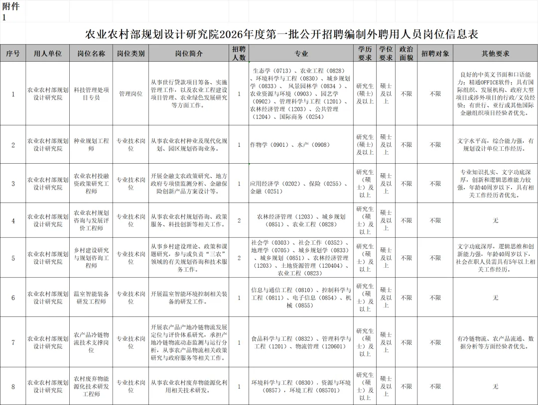 详见《农业农村部规划设计研究院2026年度第一批公开招聘编制外聘用人员岗位信息表》(附件1)。