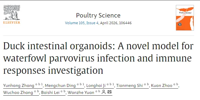 2026年1月,河北农业大学袁万哲教授团队在期刊《Poultry Science》(IF:4.2)在线发表题为:Duck intestinal organoids: A novel model for waterfowl parvovirus infection and immune responses investigation 的高水平研究论文。