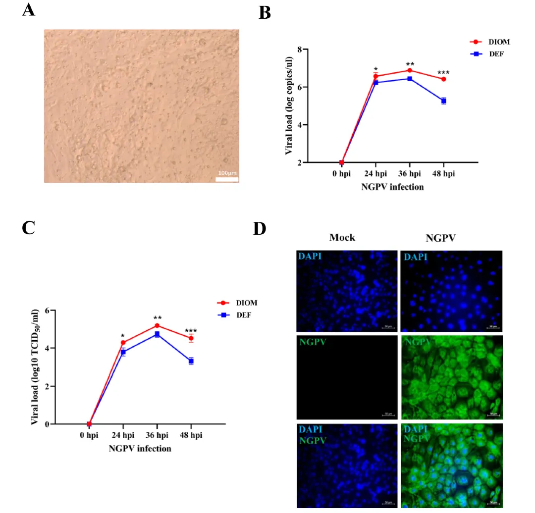 5. 病毒载量检测:RT-qPCR采用TaqMan探针法检测NGPV拷贝数,TCID50测定病毒滴度。