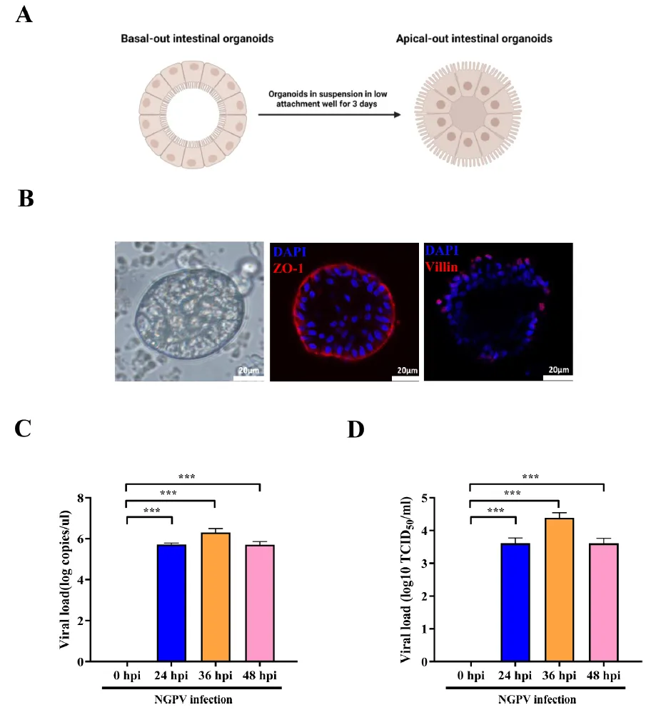Figure 4证实了顶向外出型鸭肠道类器官支持NGPV复制。图A为极性翻转示意图;图B显示顶向外出型类器官中ZO-1和Villin定位于外膜;图C和D通过RT-qPCR和TCID50检测表明病毒载量在36小时达到峰值,48小时下降,证实该模型可有效支持病毒感染。