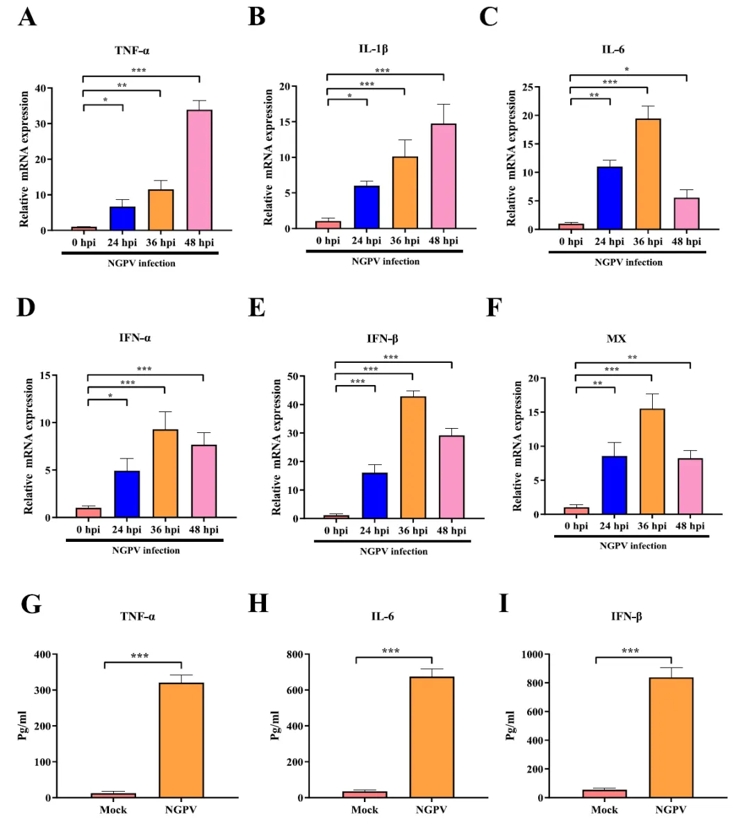 Figure 3展示了NGPV感染诱导的天然免疫应答。图A-F显示感染后TNF-α、IL-1β、IL-6、IFN-α、IFN-β和MX的mRNA水平显著上调,其中TNF-α、IL-1β、IL-6和IFN-α在36小时达峰值,IFN-β和MX在24小时即显著激活;图G-I的ELISA结果进一步证实感染36小时后TNF-α、IL-6和IFN-β蛋白分泌显著增加。