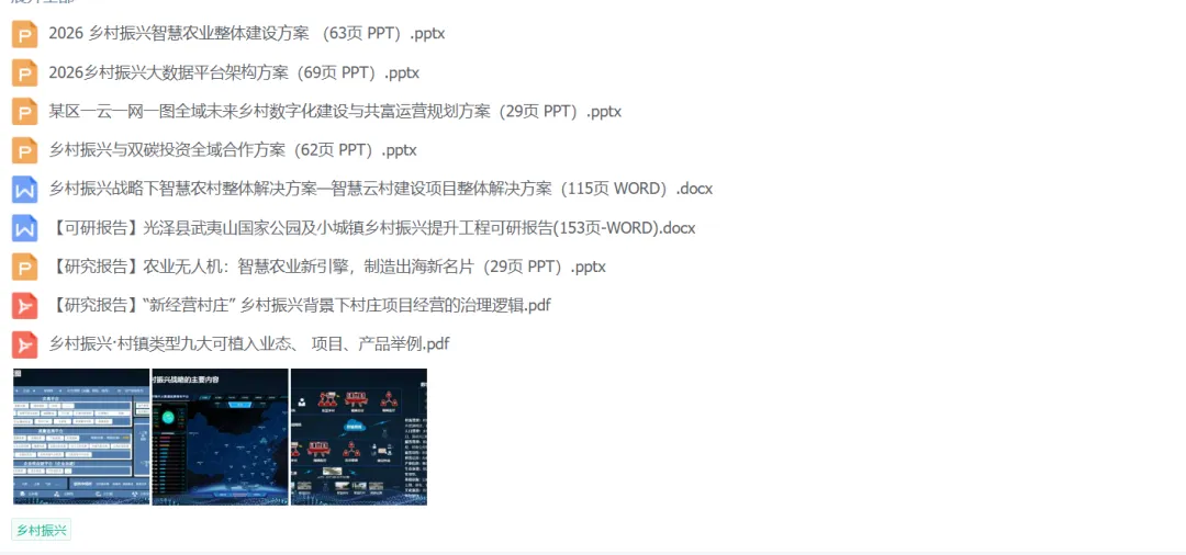 ·《乡村振兴建设指南》包含智慧农业建设规划方案、智慧农业产业园整体解决方案、数字县域助力乡村振兴、乡村振兴战略规划的编制与实施、标准行动方案···等相关内容资料,