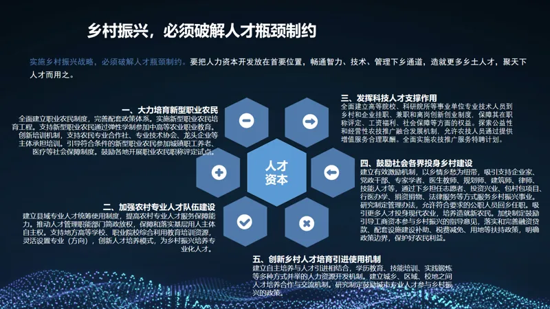 乡村振兴以产业振兴、人才振兴、文化振兴、生态振兴、组织振兴为核心框架,五大维度相互支撑、协同推进: